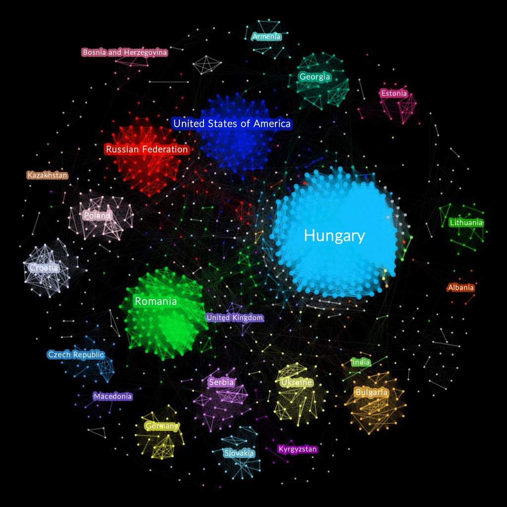 CEU has a community of almost 15,000 alumni from more than 130 countries around the world. This visualization shows their network: the nodes represent the alumni, and the links between them express their similarity. Their similarity, the weight of the links, is one if the end nodes share only one of the following attributes: citizenship, year of graduation, and program.